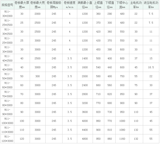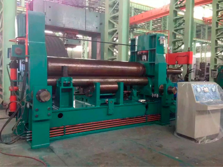 用于常温状态下将板材卷成圆筒形、圆弧形、圆锥形。性能优越,结构紧凑、操作方便。上辊升降、翻倒装置采用液压驱动。主传动由电机通过三角带传递,减速器带动两下辊驱动,卷制柔性好。采用PLC可编程显示器控制,上辊升降采用位移传感器检,测数显表显示。提高产品效率和产品质量,翻倒架采用液压翻倒。 此款型卷板机相对于机械式卷板机效率高,缺点是卷板有剩余板头需校圆或借助其他设备预弯。 本设备可卷板厚1mm-200mm,板宽8000mm的板料